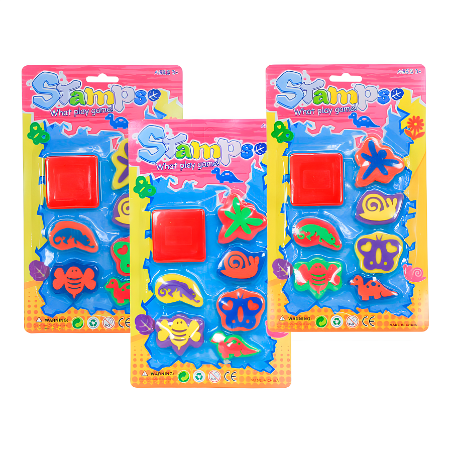 Набор из шести игрушечных штампиков из мягкого материала и штемпельной подушки с чернилами. Упакован в блистер. Цвета в ассортименте.